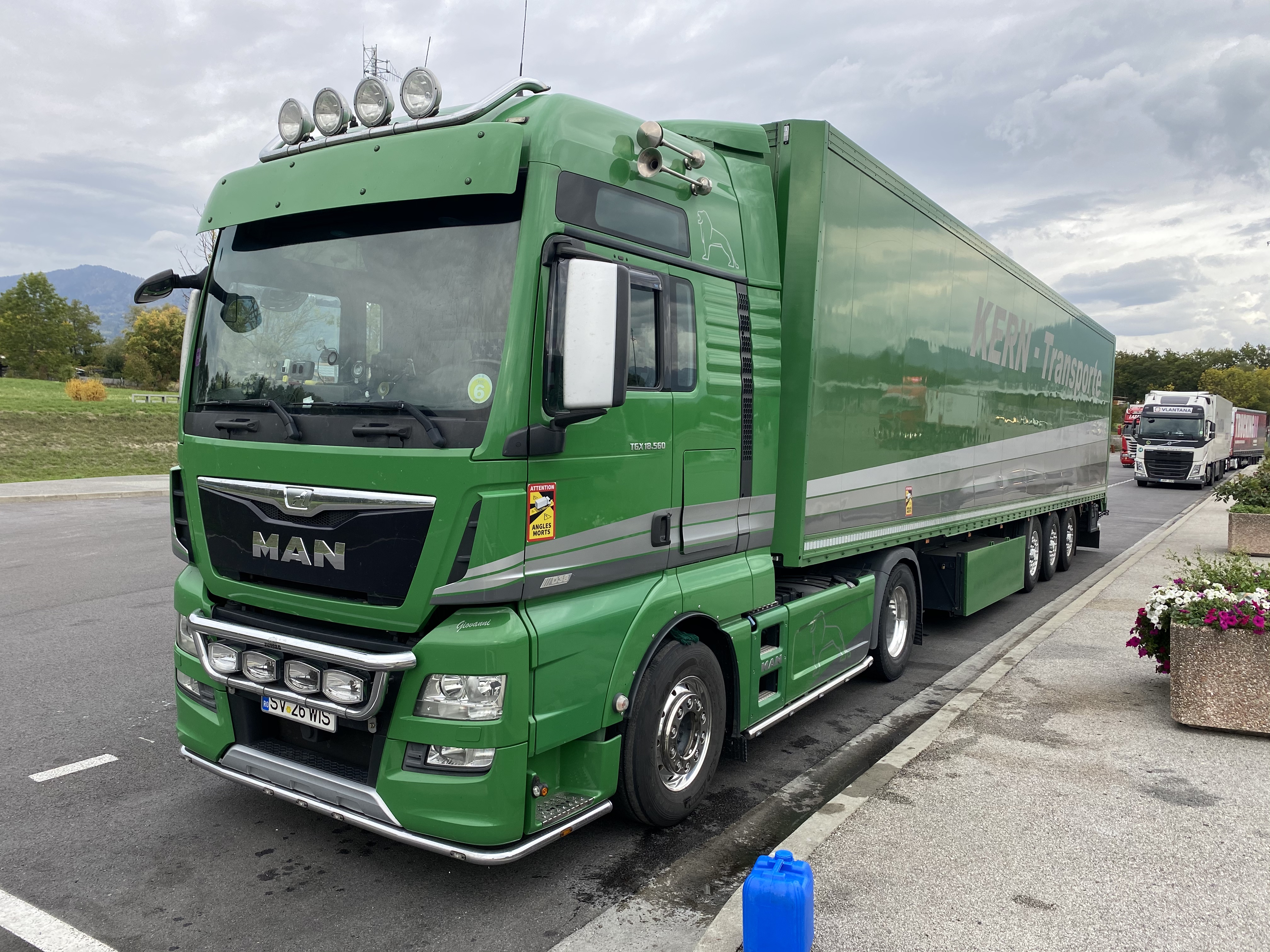 Parking pour plusieurs camions, toilettes, possibilité de prendre de l'eau.